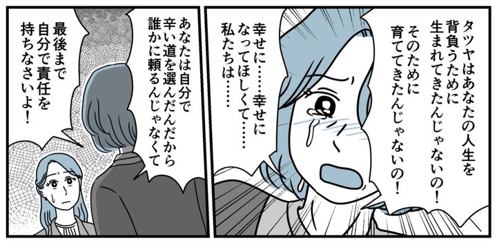 私のなかにタツヤの子どもの頃からの思い出が蘇ります。ずっと大切に育ててきました。タツヤは誰かの人生を背負うために生まれてきたわけじゃありません。感情がたかぶった私は、涙をこぼしながらチサトさんに訴えかけました。