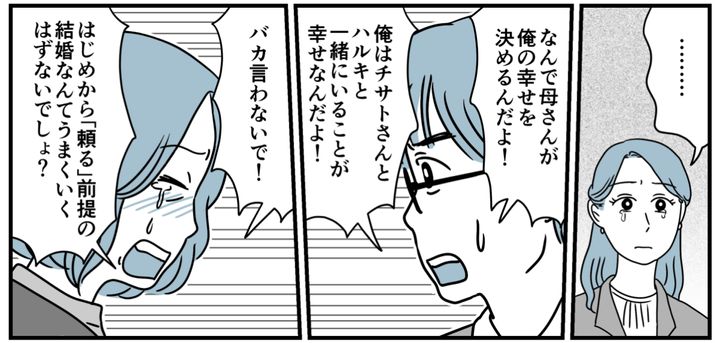 私(ヒロコ)は、夫と大学生の娘ナミ(20才)と3人で暮らしています。息子のタツヤ(24才)は社会人2年目。家から離れて都心でひとり暮らしをしており、たまにしか実家に顔を見せません。そんなある日タツヤから「会わせたい人がいる」という連絡がありました。しかしタツヤが実家に連れてきたのは、シングルマザーのチサトさん(35才)と、その息子のハルキくん(5才)だったのです。私も夫も、この結婚にはとても賛成できないと告げました。