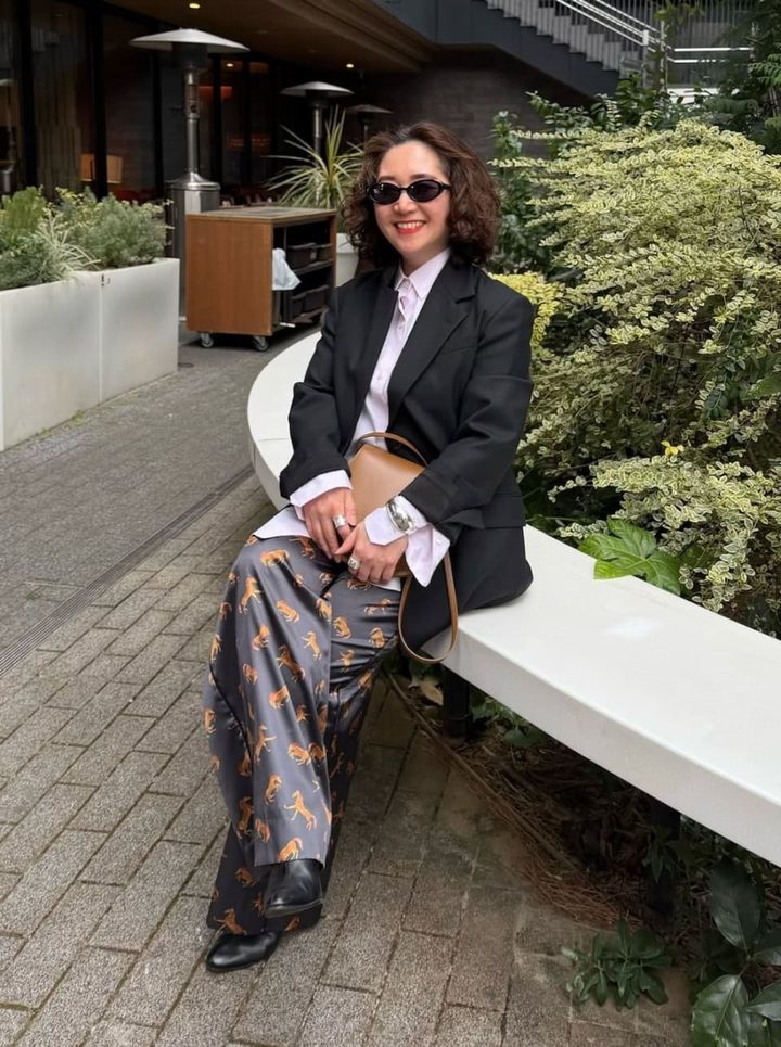 「HORSE柄のパンツに薄いピンクのシャツ+メンズライクなテーラドジャケットを合わせ、少しモードなトラッドスタイルに仕上げました。白いシャツではなくてあえて薄いピンクをチョイスし、自分のキャラクターを出したところがポイントです。グレーベースのボトムに薄いピンクの掛け合いが楽しくてお気に入り。シャーベットピンクのこのシャツはこの春、いろいろなスタイリングで活躍しそうです」