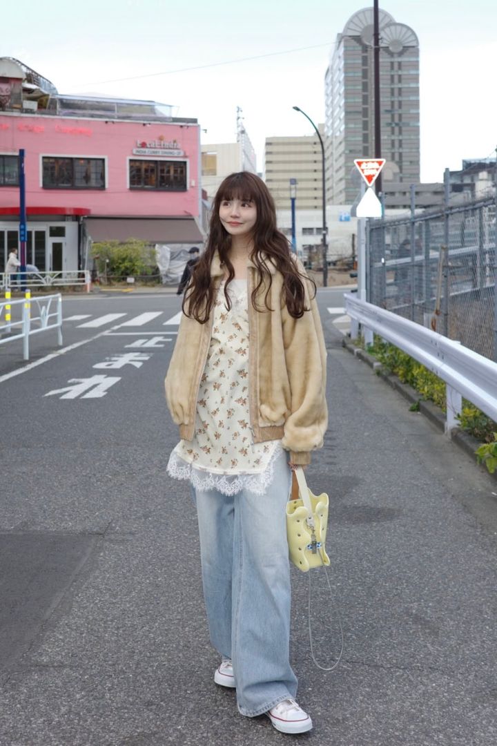 ファーアウターとキャミソールを使って、ほどよく甘さを取り入れたデニムスタイル。春を感じさせるフラワープリントのサテンキャミは、キュートなレース使いにも注目。ストレートのデニムパンツとコンバースのスニーカーを合わせて、カジュアルに仕上げています。