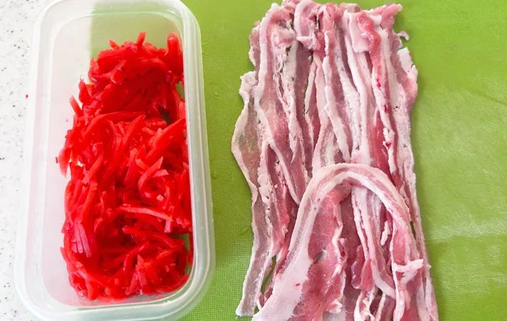 豚バラ肉を少しずつ重ねながら広げ、その上に紅ショウガをのせます。