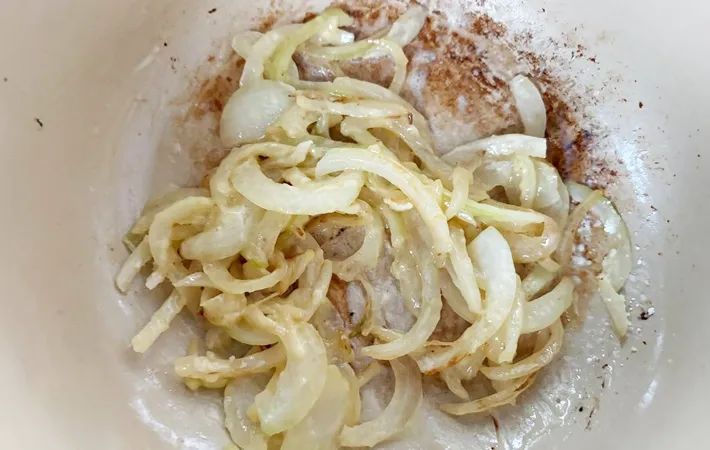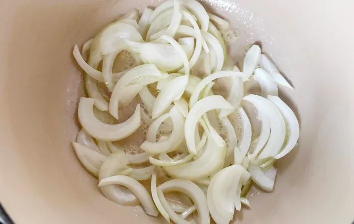 鍋にバターとタマネギを入れ、タマネギがしんなりするまで炒めます。