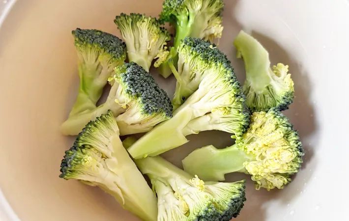 ブロッコリーは小房に分け、耐熱容器に入れて600Wの電子レンジで3分加熱します。