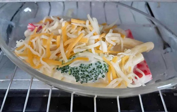ホワイトソースを耐熱皿に入れ、チーズを散らしてオーブントースターで5分程焼きましょう。