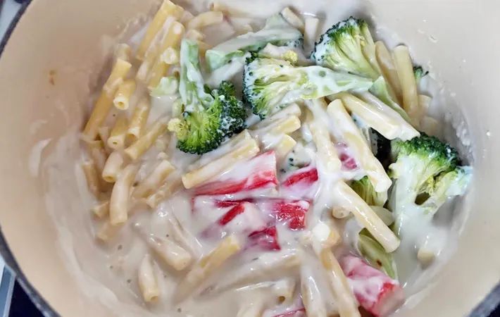 カニカマ、ブロッコリー、マカロニを加え全体を混ぜます。