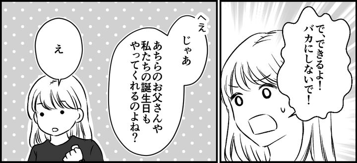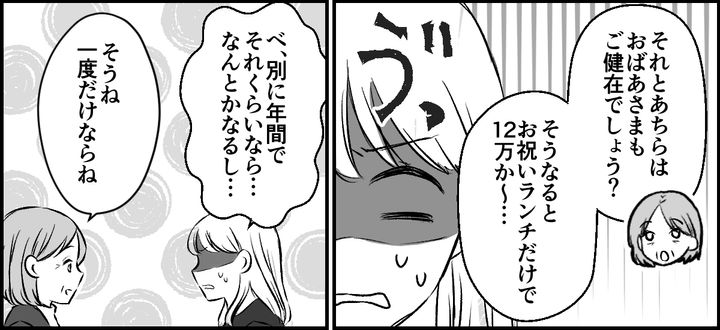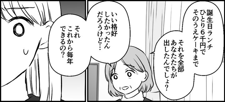 義両親にいい顔をしたくて豪華なランチとケーキ代をすべて負担したことについて、「毎年それができるの?」と指摘されました。私は何も言い返せなくなりました。