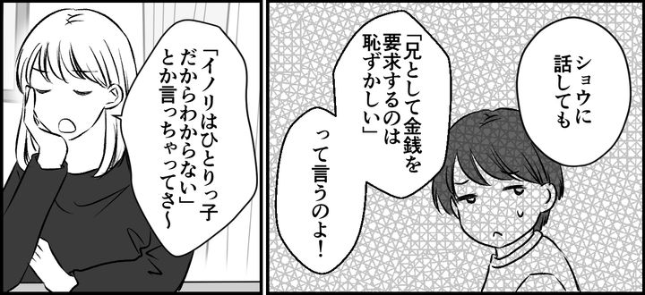 私はイノリ。夫のショウと6か月の娘マホの3人暮らしをしています。義母の誕生日会後、私はショウに義弟の文句を言いました。しかしショウは、「兄として金銭を要求するのは恥ずかしい」などと言うのです……。大人として別の世帯を持った以上、きちんと請求すべきだと訴えましたが、ショウは「男きょうだいはそういうものだ」と取り合ってくれません。お店の手配をすべて行った私にとって、義弟が何もせず、お金すら出さなかったのには納得がいきません。今後も義弟の飲食代を負担するのかと考えると、モヤモヤが募るばかりです。