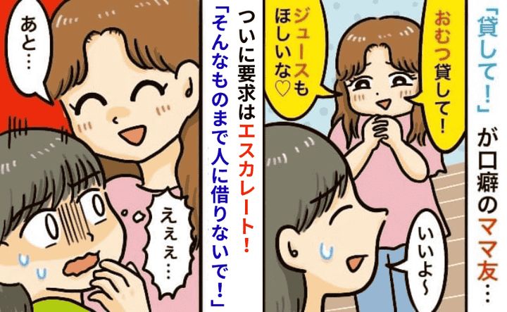 また、「貸して」と言われても、おしりふき数枚やジュースを返してもらうわけにもいかず、さらにモヤモヤ。とはいえ、ママ友と話す時間でかなりリフレッシュしていた私は、気まずい関係になることを恐れて不満を言い出せずにいました。