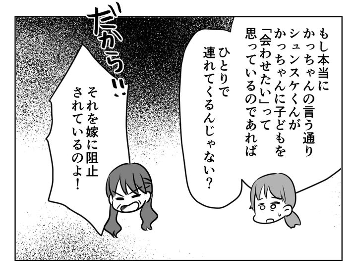 私(カツコ)は、女手ひとつで息子・シュンスケを育ててきました。シュンスケは昔からとてもいい子。私の一番の理解者であり、私もシュンスケにとって一番の理解者だったことでしょう。そんなシュンスケも今では立派な父親です。しかし私は孫が生まれてすぐに産院で会ったきり、以降まったく会わせてもらっていないのです。何度も連絡したし、会いにも行きましたが……。すべて嫁であるアスカさんの差し金でしょう。私はアスカさんに壮大な復讐をすべく、策を練っていたのでした。