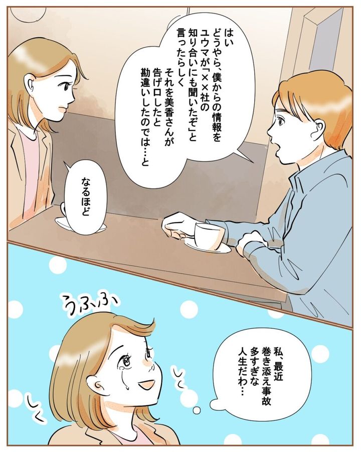 「はい。どうやら僕からの情報を、ユウマが『××社の知り合いにも聞いたぞ』と言ったらしく、それを美香さんが告げ口したと勘違いしたのでは・・と」佐藤さんにそう言われて「なるほど」と答えたものの、「私、最近巻き添え事故多すぎな人生だわ・・」そう思い、不遇な状況に涙がこぼれました。
