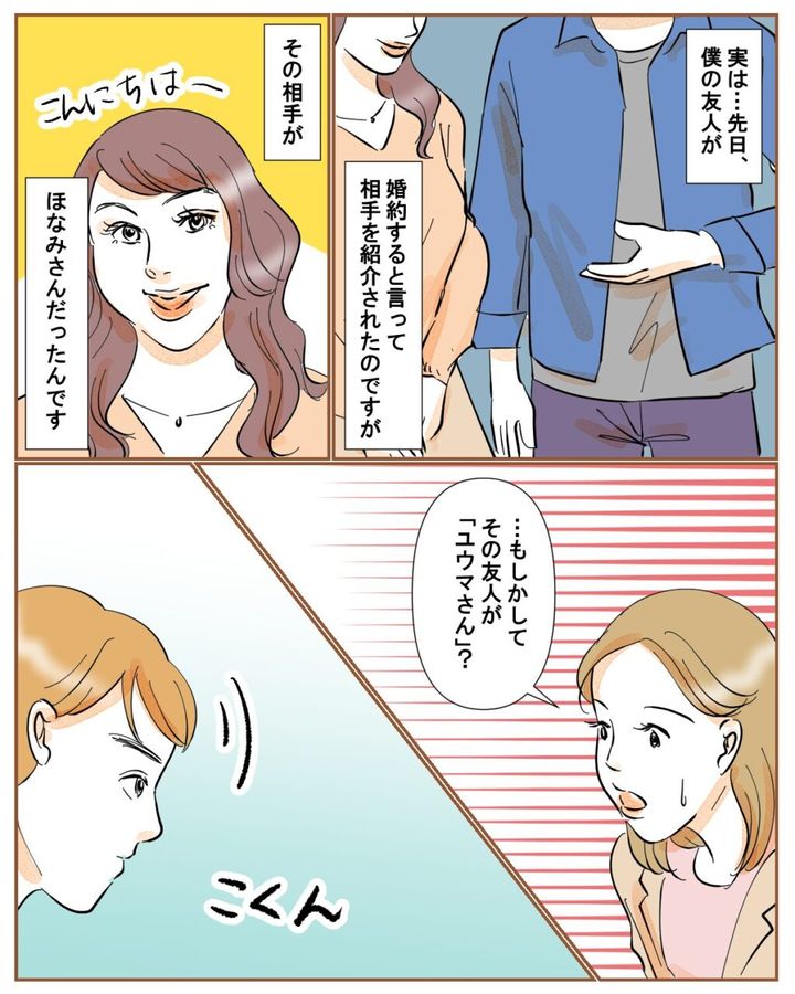 「実は先日、僕の友人が婚約すると言って婚約者を紹介されたのですが、その相手がほなみさんだったんです」佐藤さんの言葉に、「・・もしかしてその友人が『ユウマさん』?」私がそうたずねると、佐藤さんがこくんと頷きました。
