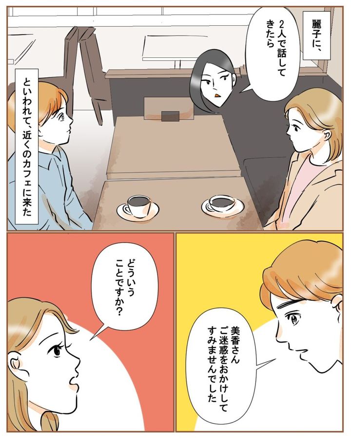 その後、麗子に「2人で話して来たら?」と言われ、佐藤さんと2人でカフェに。すると、「美香さん、ご迷惑おかけしてすみませんでした」と謝る佐藤さん。突然の謝罪に訳が分からず「どういうことですか?」とたずねました。