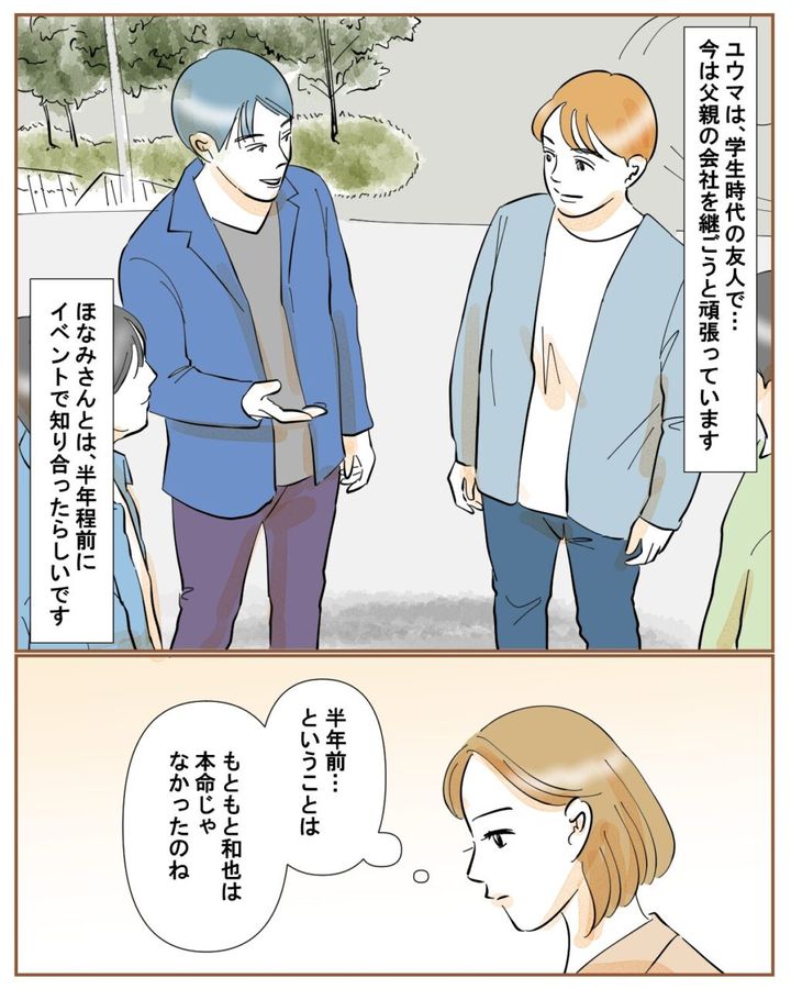 「ユウマは、学生時代の友人で・・今は父親の会社を継ごうと頑張っています。ほなみさんとは半年程前にイベントで知り合ったそうです」淡々と話す佐藤さんの話を聞きながら、「半年前・・ということは、もともと和也は本命じゃなかったのね」と元夫の不倫を時系列で考えていました。