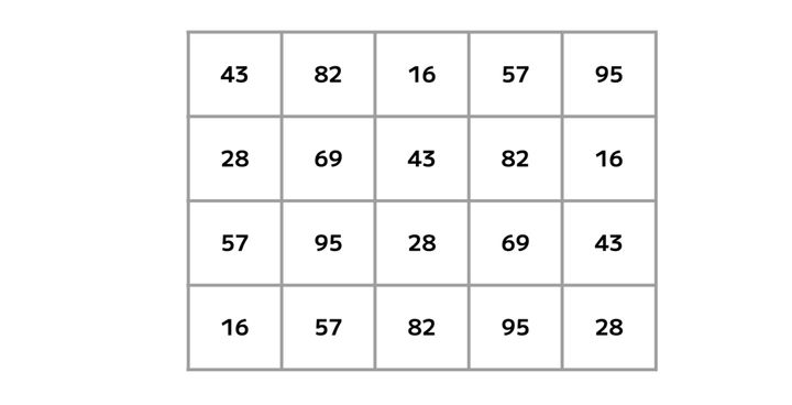 5×4の表に書かれた7種の数字「16・28・43・57・69・82・95」。1種だけ2つしかない!?その数字はどれだ??