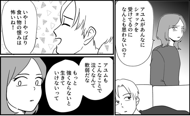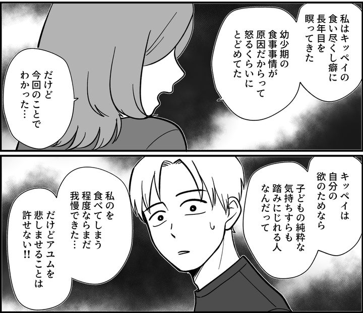 私はカナミ。キッペイの食い尽くし癖により、わが家の食卓は常に空気が最悪。夕食のカレーで肉ばかりをすくうキッペイに注意しても、笑ってかわされるだけでやめようとしてくれないのです。結婚前は食い尽くし癖なんてなかったのに……まるで人が変わったかのような行動に虚しさと情けなさを感じます。愛情が日に日に冷めていっていることも自覚しています。そんななか、アユムがお小遣いで買って楽しみにしていたお菓子が、ひと口も食べていないのに空っぽになっているのを発見。まさか……キッペイが食べたわけじゃないですよね?