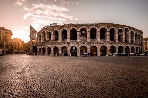 千年以上の歴史を誇り、ルネサンス期の建築が街並みを彩るヴェローナ。「アレーナ・ディ・ヴェローナ」は、この街の中心にある古代ローマ時代の円形闘技場で、かつて剣闘士たちの戦いが繰り広げられた場所。ローマ帝国の初代皇帝アウグストゥスから、4代皇帝のクラウディウスの時代に建設され、西暦30年頃には完成していたと伝えられる。
