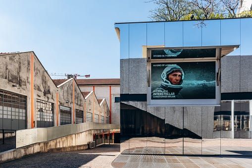 アイスホッケーの試合が行われる「アリーナ・イン・サンタ・ジュリア」から、地下鉄を使い、30分ほどで到着するのが、プラダ財団が2015年にオープンした「フォンダツィオーネ・プラダ」だ。設計は、レム・コールハース率いるOMA。既存の建物7棟をリノベーションし、新たに3棟を設計した。この3棟のうち「ポディウム」で企画展、「トッレ」で常設展が催され、「シネマ」はマルチメディア対応のホールとして使われている。