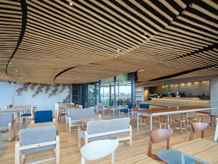 設計を手掛けたのは、建築家の隈研吾。これまでも「スターバックス リザーブ® ロースタリー 東京」や「スターバックス コーヒー 太宰府天満宮表参道店」など、地域の風土や景観に寄り添う「スターバックス」の店舗建築を数多く担当してきた。本施設でも、霧島山や沖水川を望む立地に呼応し、都城の風土に調和する建築が目指された。内部に入ると、晒竹(さらしだけ)のゆるやかな曲面天井が続き、竹本来の温かみが広がる開放的な空間が来場者を迎える。
