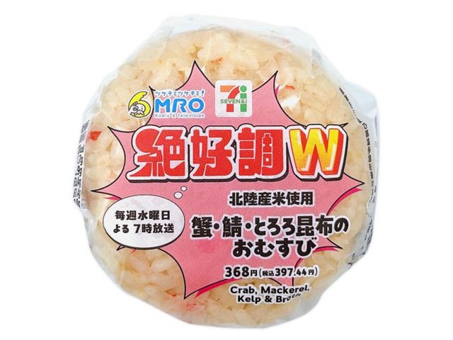 蟹・鯖・とろろ昆布、北陸の海の幸3種をひとつのおむすびに詰め込みました。 カロリー:323kcal 【販売地域】北陸