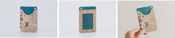 表面にも裏面にも収納可能なパスケース。角の穴にチェーンを通してバッグハンドルにつけるほか、ストラップ紐をつけIDケースとして使えます。(※チェーンやストラップは付属しません)
