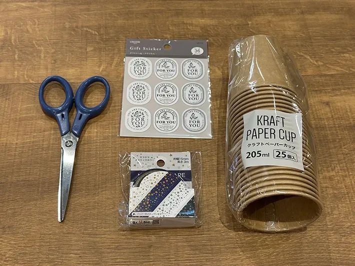 本記事で紹介するのは、『セリア』の紙コップを使った『バッグ風ラッピング』です。必要な道具は以下の通り。