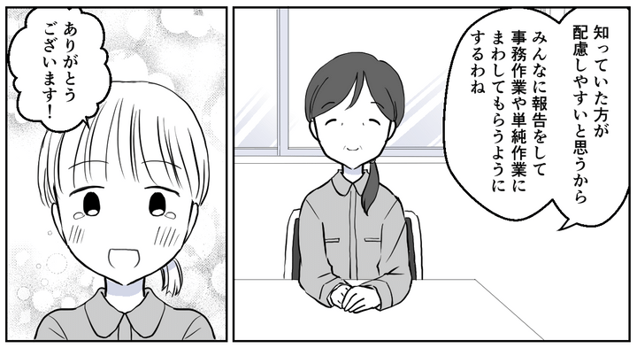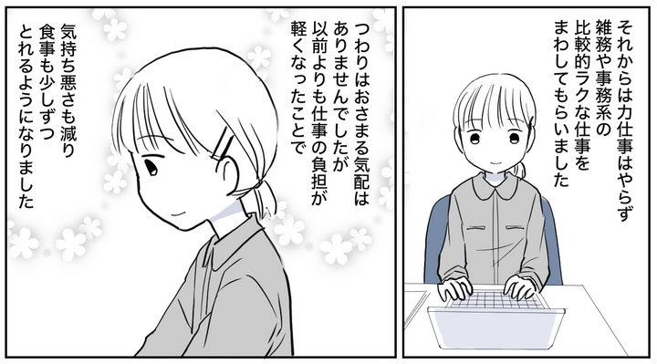 妊娠してつわりがひどく食事もとれず、力仕事が難しい状況であることを理解してもらえました。女性の上司であるキヨカさんは、妊娠を喜びつつも私の体調を気遣い、力仕事を免除し、座ってできる業務の方が負担が少ないだろうと提案してくれました。