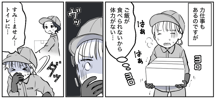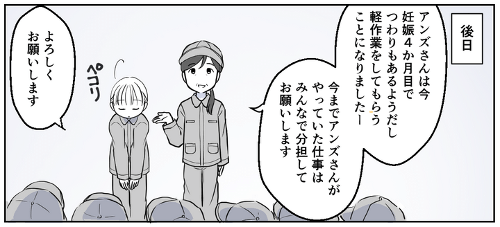 私はアンズ(25)。1年前にテツジ(29)と結婚をして、現在妊娠3か月目です。つわりがあり、船酔いをしたみたいに気持ちが悪くて、1日に何度もトイレにかけこみます。けれど生活のためには仕事を辞めるわけにもいかず、気持ち悪いのをガマンして、妊娠前から勤めている職場へ行っていました。私は工場勤務で、女性でも力仕事があります。つわりで苦しくご飯が食べられないからフラフラで、どうすればいいのか悩んだ末、上司のキヨカ(55)さんに今の状態を相談することにしたのです。