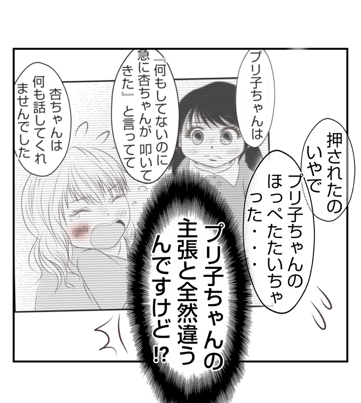 幼稚園の先生によると、2人のケンカについてプリ子は「何もしていないのに杏ちゃんが急に叩いてきた」と主張しているという。