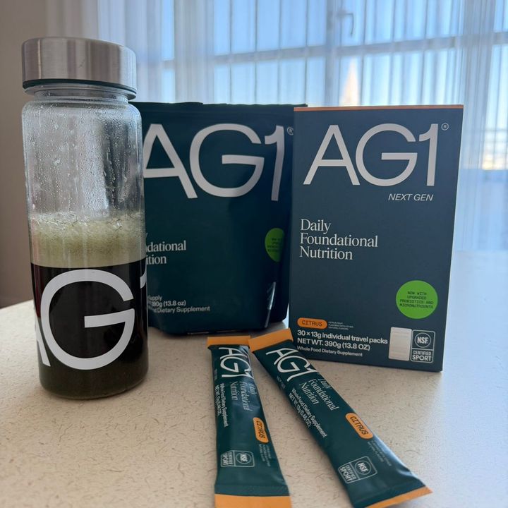 「AG1」は、スピルリナや青野菜、ビタミン、プロバイオティクスなど、栄養素が豊富に入ったウェルネスドリンク。内側からのリズムを整えるのはもちろん、美容コンディションや全身の健やかなベースづくりのために毎朝飲んでいます。飲むと前向きなスイッチが入るような気がしてお気に入り。