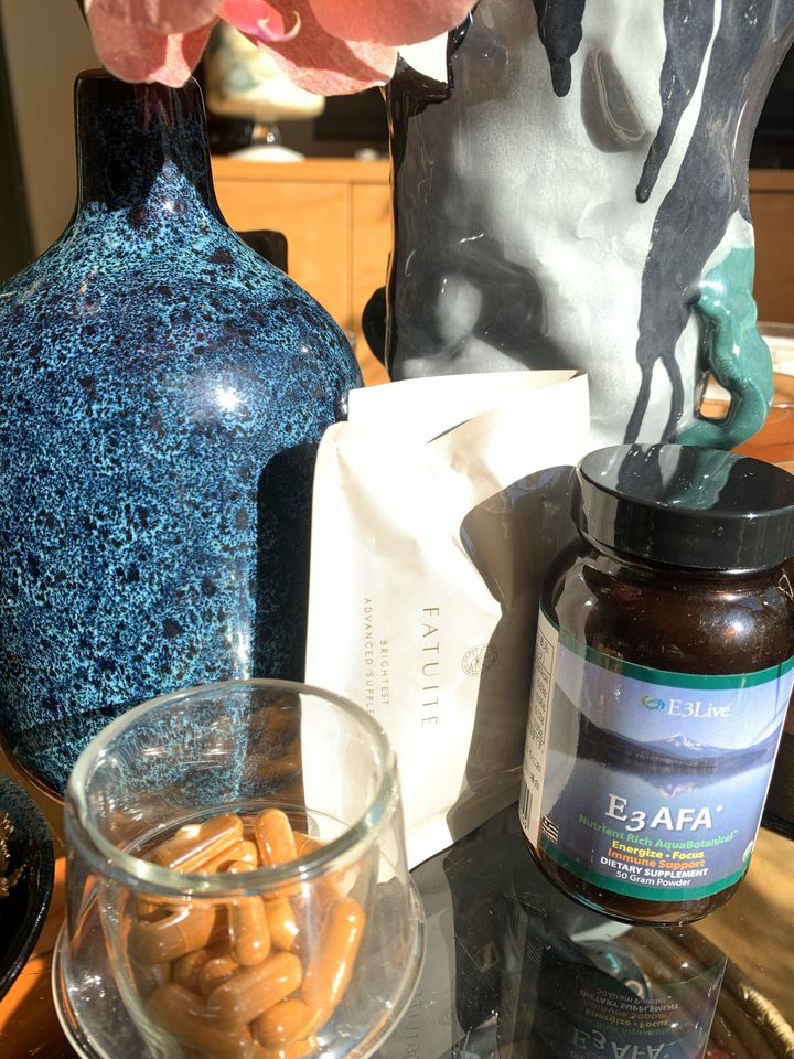 サプリメントも味方に。藻由来のアスタキサンチンを配合した「ファチュイテ」のカプセルは、朝食後の習慣。また、13年来のお守り的存在である「E3Live」は、外食が続いた時などのレスキューアイテムとして常にストックしています。保存のきくパウダータイプを朝一番に水で溶いて飲むと、内側から整う安心感が。