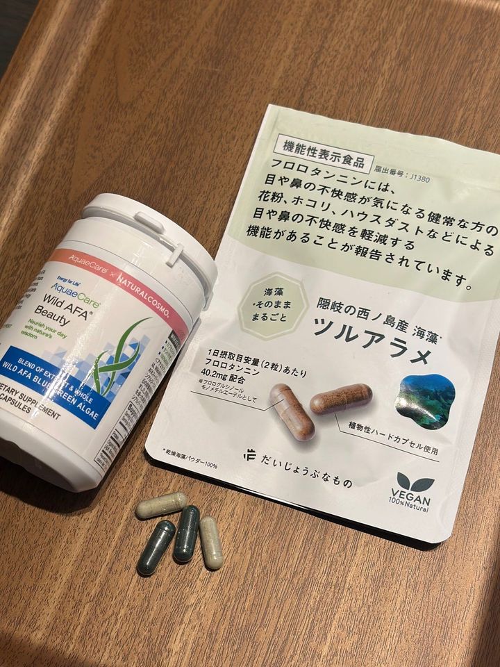 ブルーグリーンアルジー配合のパウダーやカプセルは、10年以上継続して飲み続けている私にとってお守りのような存在。「アクエケア」や「E3Live」のパウダーを溶かした水をボトルに入れて持ち歩くほか、隠岐の西ノ島に自生する海藻「ツルアラメ」のサプリも愛飲。ツルアラメには抗アレルギー作用があり、花粉やほこりなどによる不快感を軽減する機能が報告されているそう。私自身は花粉症ではないのですが、春先に目や鼻がムズムズするため、予防を兼ねたセルフケアとしてとり入れています。