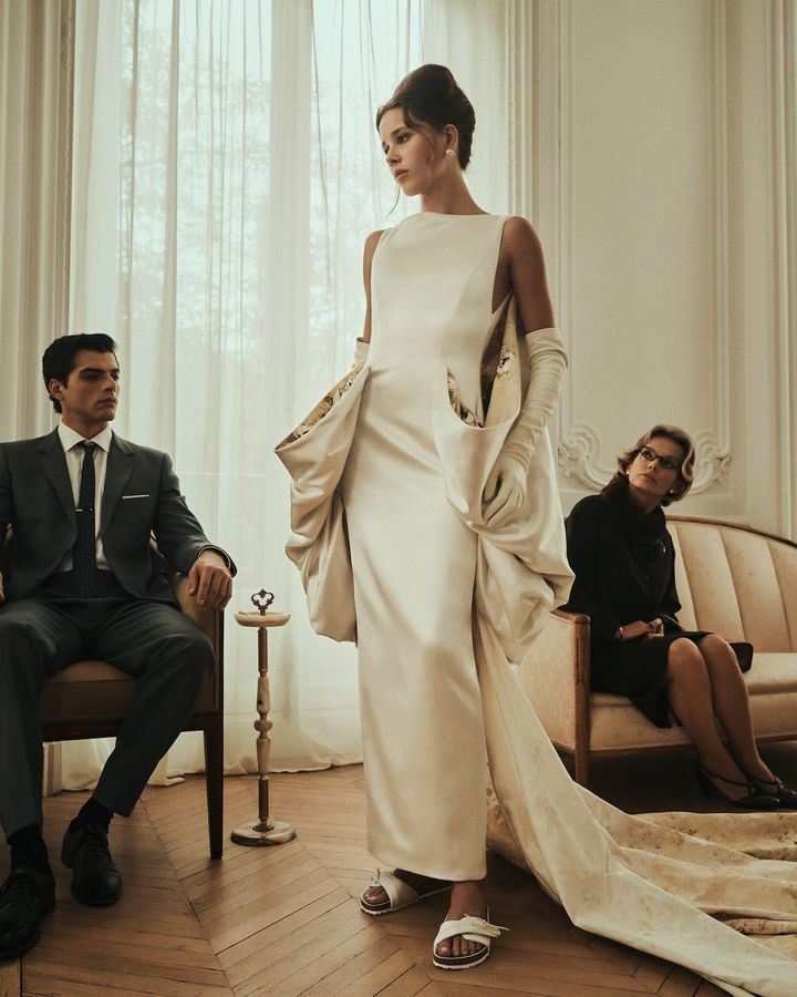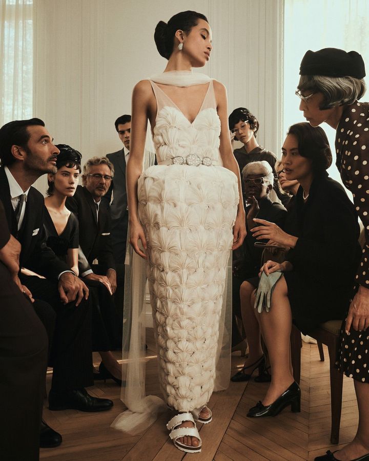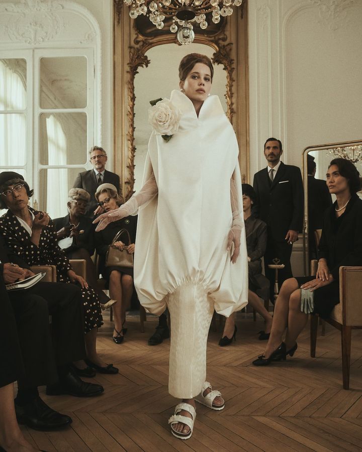 ビルケンシュトックのキャンペーンビジュアルにあたって、私の中では最初から、1950〜60年代のクチュールサロンをオマージュした表現を思い描いていました。そこでは、観客役として登場するエキストラたちも、フットウェアそのものと同じくらい物語の核となる存在です。彼女たちの個性やリアクションがストーリーを動かし、驚きやユーモア、そして喜びに満ちた空気感をイメージにもたらしています。