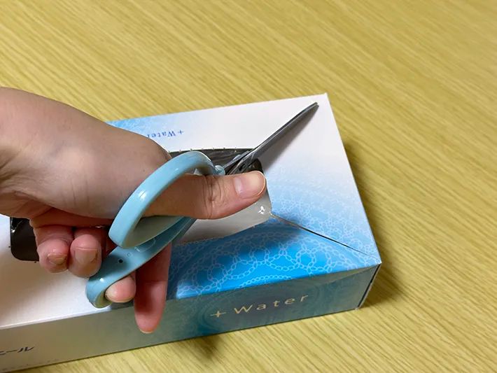 まず、ティッシュ箱の表面にある取り出し口から角に向かって、ハサミで切り込みを入れます。