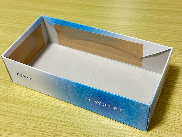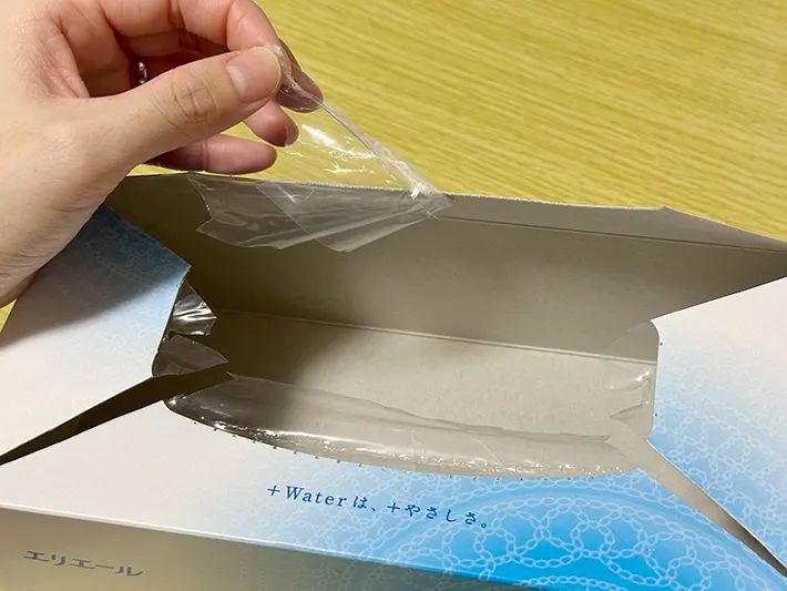 ティッシュ箱によって違いがあるかもしれませんが、筆者が購入しているティッシュの場合は、端からゆっくりめくることできれいに剥がせました。