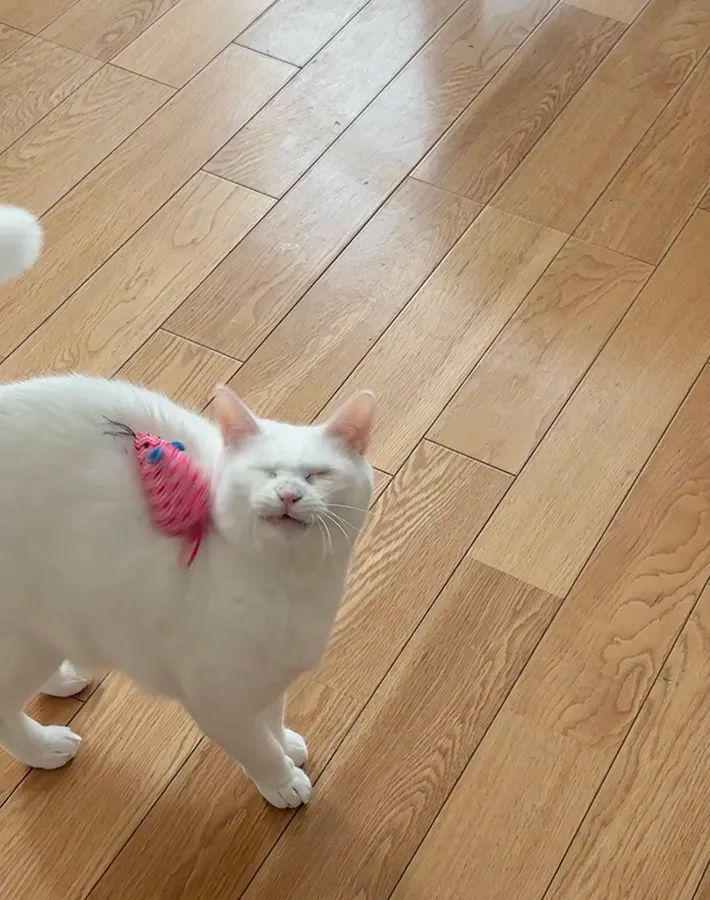愛猫の1匹、ねるくんと、ネズミのやわらかいオモチャで遊んでいた飼い主さん。