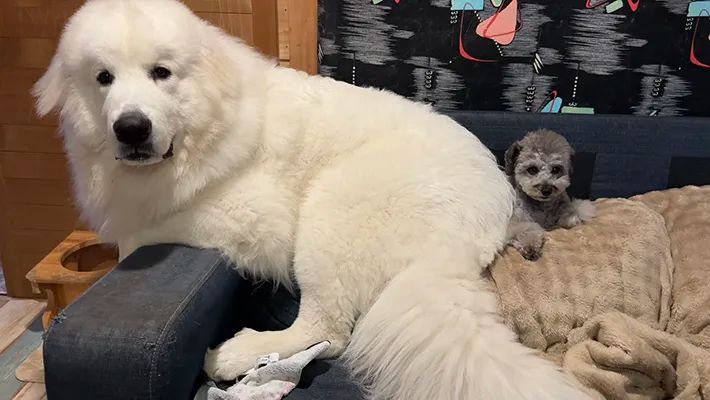 大型犬のグレートピレニーズである、BONBONくんは、体は大きいものの、年齢相応で甘えん坊な行動を見せるのだとか。この時も『家族』に体をぴったりとくっつけていました。