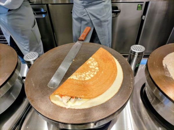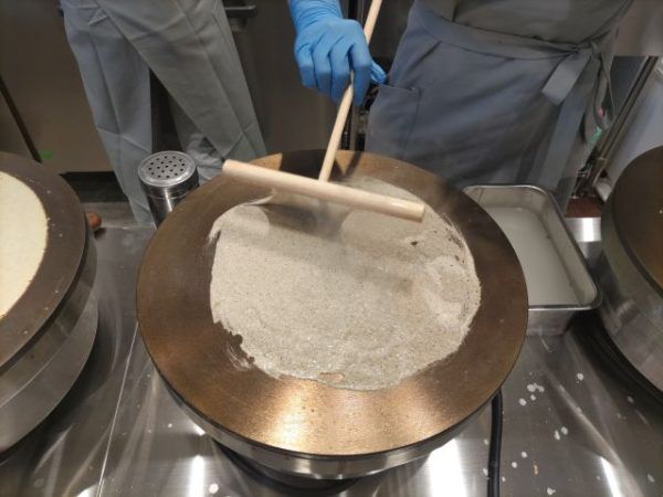 通常、クレープは、生地の両面を焼くのですが、こちらでは、片面のみ。この焼き方により、サクサクもちもちの生地になるそうです!