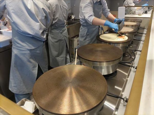 クレープ焼き器が5台あり、焼いている様子を見ることが出来るので、待ち時間も楽しめますよ!