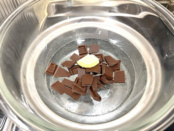 1. ボウルに板チョコとバターを入れて60℃くらいの湯煎にかけ、シリコンベラでかき混ぜながらゆっくり溶かす。