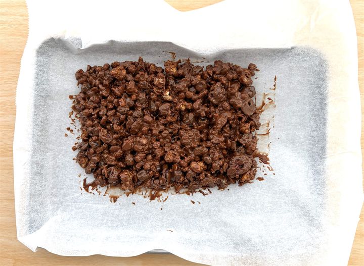 3. バットなどの容器にクッキングシートを敷き、2を入れる。シリコンベラで押して平らにし、ラップをかけて冷蔵庫で2時間程冷やし固める。チョコレートが固まったら取り出して、包丁でお好みの大きさにカットする。