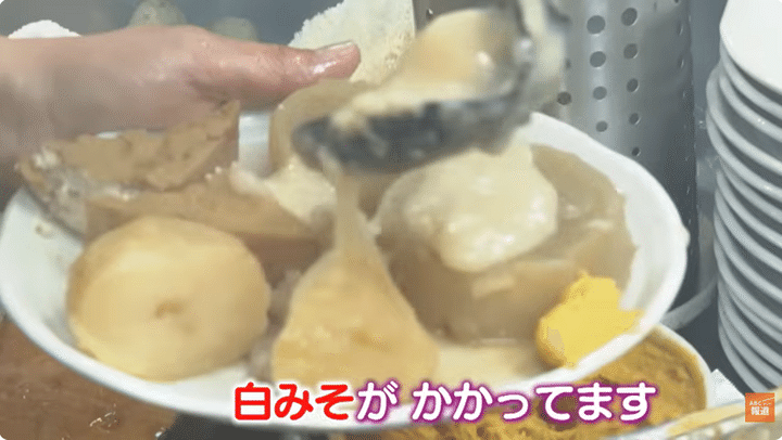 【動画】白みそだれをかけるのは、大根、豆腐、牛すじ、糸こんにゃくの4つ。ほかの具材にも「かけて」とリクエストする白みそファンも少なくないそう。