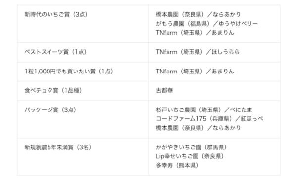 また、金賞には、橋本農園(奈良県)の「ならあかり」とLip幸せいちご園(奈良県)の「古都華」が選出。ネクストブレイク部門において品種を対象とした「食べチョク賞」には、奈良県のオリジナルブランドいちご「古都華」が受賞するなど、奈良県のいちごの存在感が際立つ結果となりました。