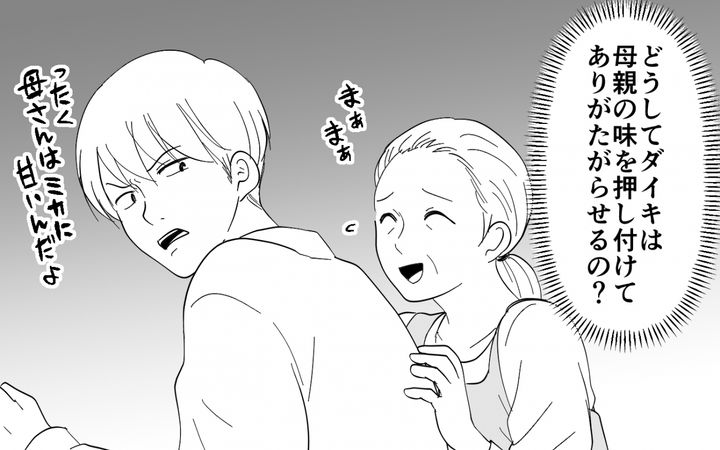 ホテル泊を拒否された妻は義実家で義母の説得を試みる。しかし義母の味を守りたい夫に「家族の味を壊すな」と責められてしまう。