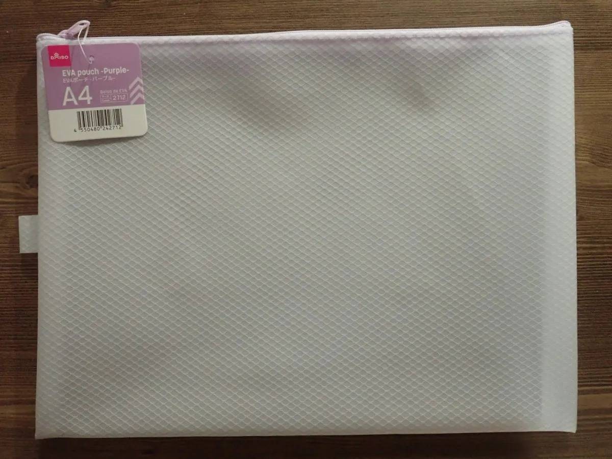DAISO(ダイソー)の「EVAポーチ -パープル- A4」は、環境にやさしいEVA素材を使ったポーチです。