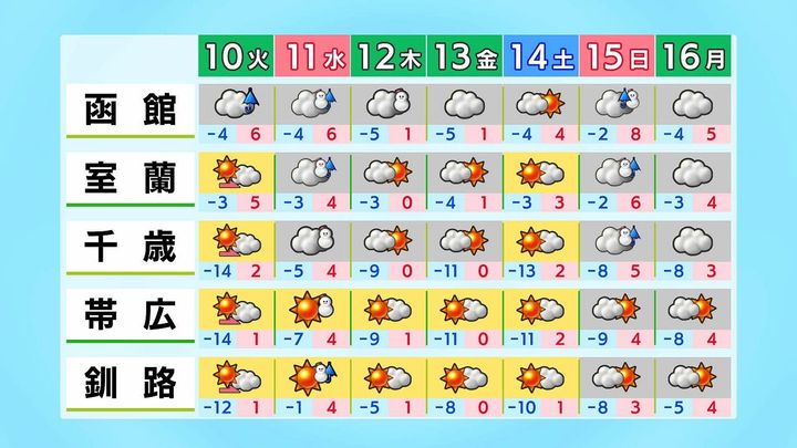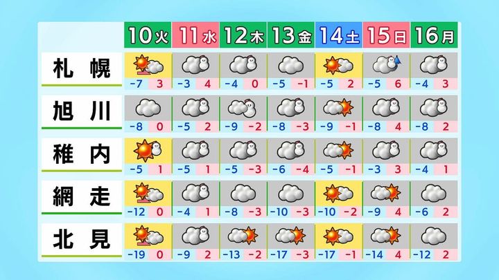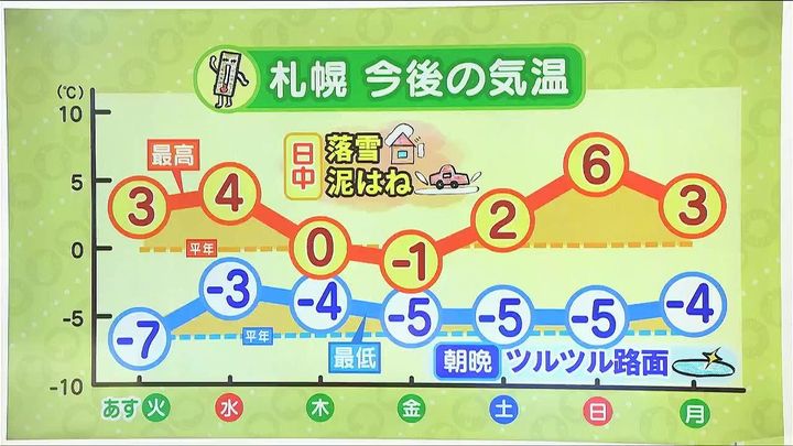 札幌の予想気温は平年並みか高く、日中はプラスの日が多くなります。最高気温は、あす10日(火)は3度、週末は5度を超えます。