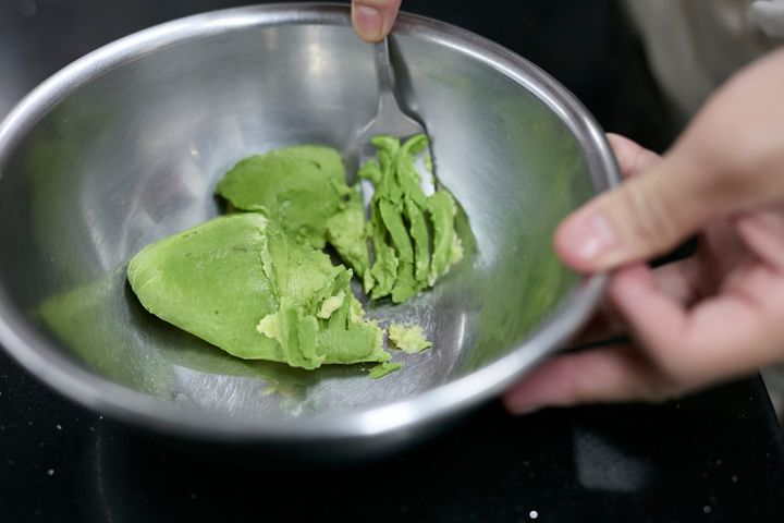 アボカドは半割りにしてフォークでつぶすことで、ごろごろした食感が残りつつ、マヨネーズやレモン汁などと味が馴染みやすくなります。