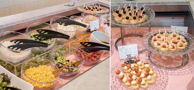 フレッシュなサラダも用意されヘルシー。「選べるピンチョスブリニ」はトマトとモッツァレラチーズのカプレーゼや生ハムとオリーブ、シュリンプなどがそれぞれクレープ風の “ブリニ” にのっていて3種類の味を試せます。