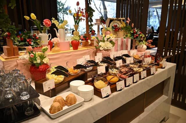 セルフでパフェを作れるのも楽しい試み。クラフトパフェコーナーにはフルーツやジャム、色とりどりのチョコレートやエディブルフラワーまで15種類以上のトッピングが並び、オリジナルパフェを作れます。ストロベリースイーツブッフェの期間中はいちご味のソフトクリームも登場します。