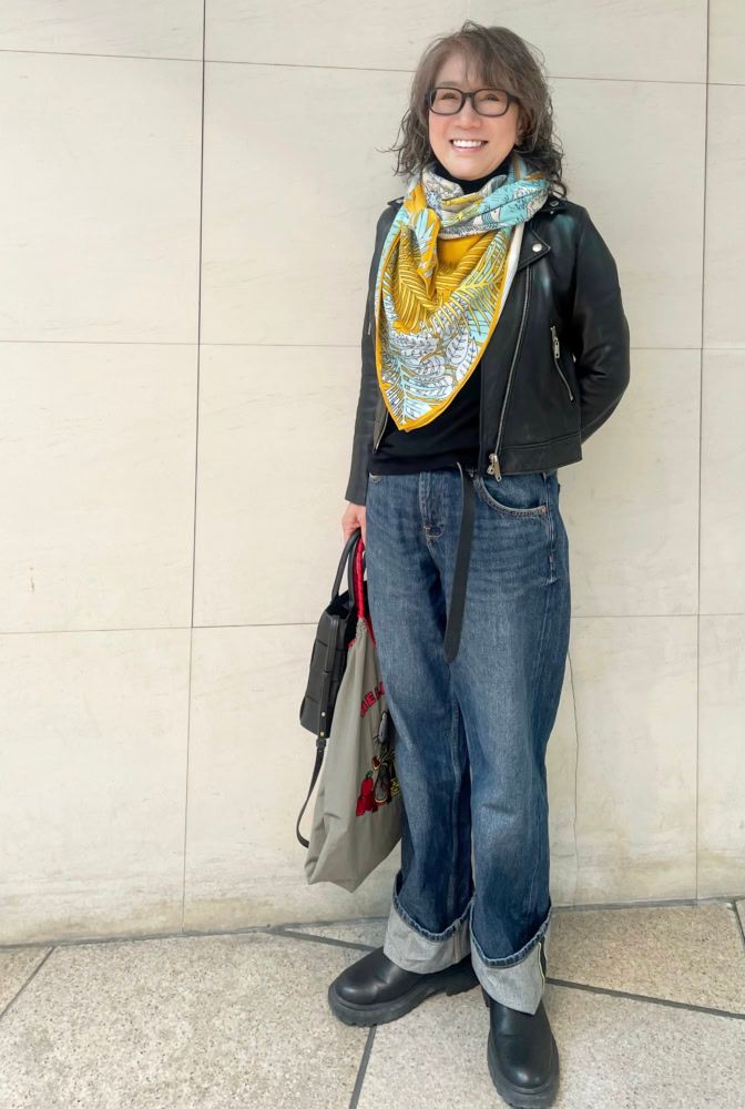 【60代お手本スナップ】軽やかな「大人のライダーススタイル」は、遊び心と抜け感が決め手!スカーフとキャラクターアイテムで作る、大人可愛い着こなし