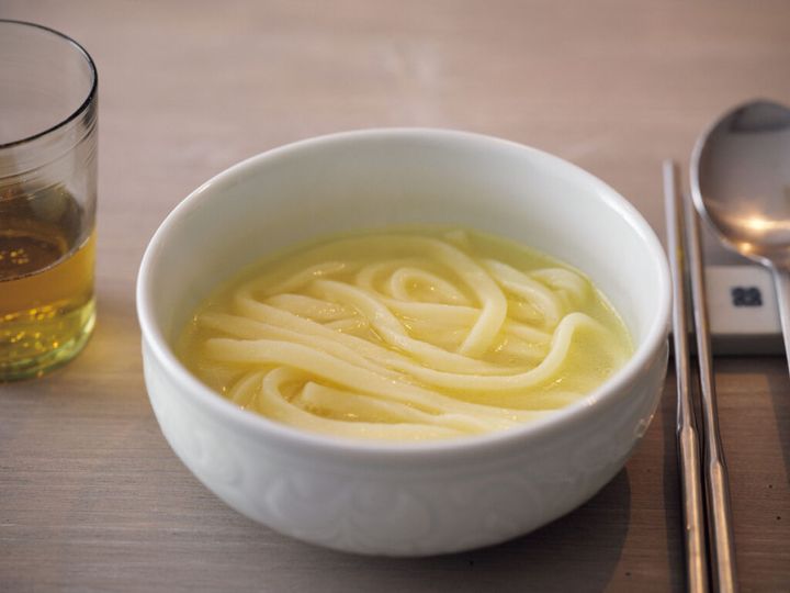 冷凍うどんを入れるだけ。にんにく香る鶏のうまみたっぷりのスープでいただくうどんは、しめの最高峰! フレンチマスタードのなかでも、ホットドッグなどにつけるイエローマスタードが、お店の味を再現できておすすめです。